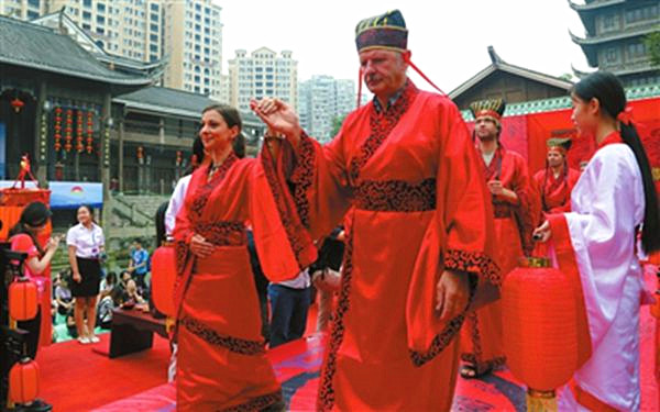 在南溪古街,由12名歐洲熊貓粉絲傾情演繹的漢式集體婚禮成為線路考察中的一大亮點(diǎn)。在悠揚(yáng)的誦讀聲中,身著漢式服裝的“新人”依次入場,禮道兩旁的侍女持宮燈引導(dǎo),新人行拜堂、沃盥、對席、同牢、合巹、結(jié)發(fā)、執(zhí)手禮,整套漢式婚禮禮儀逐一演繹,讓習(xí)慣了婚紗禮服的老外們親身感受了一番中國傳統(tǒng)婚俗文化。在這里,與會(huì)嘉賓們還實(shí)地參觀了著名小吃“南溪豆干”的制作流程,欣賞了極具當(dāng)?shù)靥厣墓艠繁硌荨?